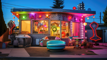 Colorful, empty arcade with neon lights and retro gaming machines