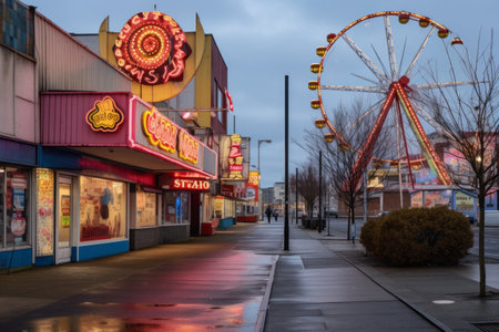 A ferris wheel night neon light amusement park empty wet ground moody atmosphere