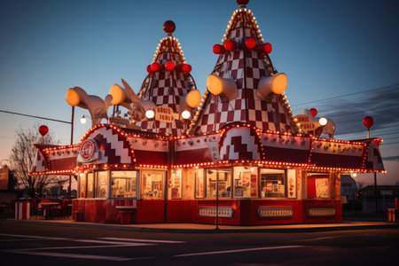 Vibrant circus flags and neon lights create a magical atmosphere during evening festivities