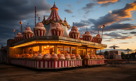 A colorful carnival ride adorned with numerous donuts on top, ready to provide a thrilling experience for visitors.
