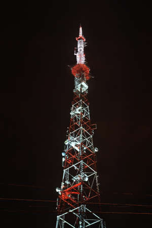 Red and white communication tower with GSM antenna transmitters.