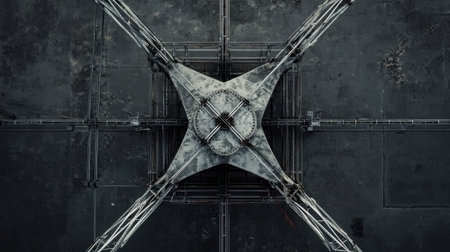 This aerial shot captures an industrial structure with a symmetrical design, showcasing the contrast between dark tones and concrete textures, ideal for urban themes.