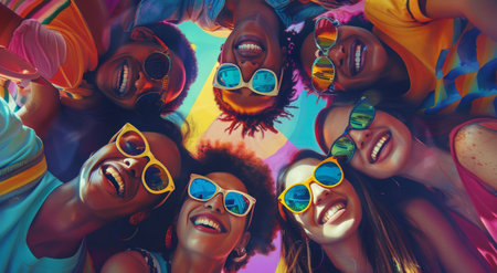 A Vibrant multicultural friends laughing together in colorful urban setting