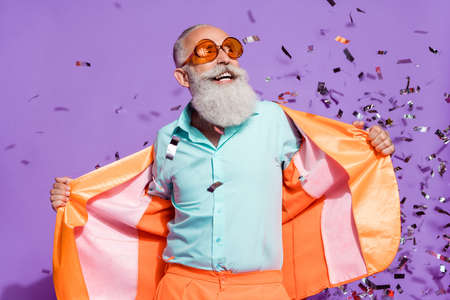 Photo of dreamy positive old man confetti fall look empty space take off blazer isolated on violet color background