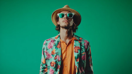 A stylish person wears a combination of layers and colors embodying selfexpression in front of a green canvas