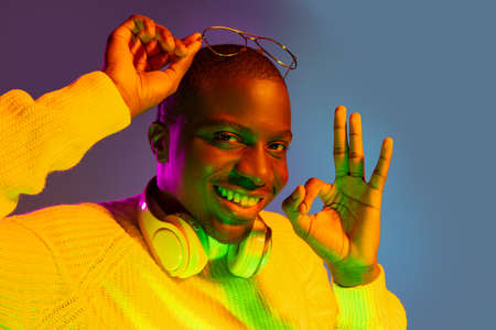 Smiling happy African handsome man posing isolated over gradient magenta yellow neon background.