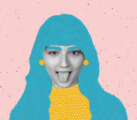 Contemporary artwork. Creative picture. Inspiration, idea, trendy urban magazine style. Cheerful girl with digital bright drawings on her face, head