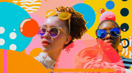 Two women wearing sunglasses and one wearing a pink headband. The image is a collage of different colors and shapes