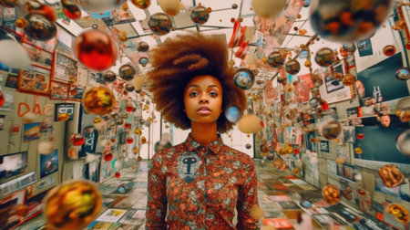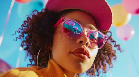 A woman with curly hair and pink sunglasses is standing in front of a bunch of balloons. The balloons are in various colors, and the woman is wearing a yellow shirt. The scene has a fun