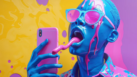 Surreal blue-skinned person with pink sunglasses licking a pink phone against a vibrant yellow and pink background.