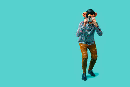 a young man, wearing a monkey mask, takes a picture with a retro instant camera, standing on a blue background with some blank space on the left