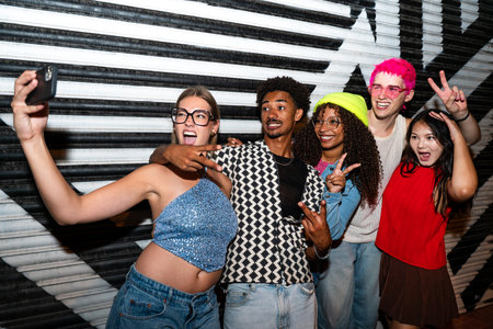 Group of friends taking selfie with mobile phone having fun at the party at night. Crowd of happy multiethnic people