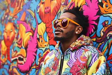 Young african american man with afro hairstyle and sunglasses against graffiti wall.