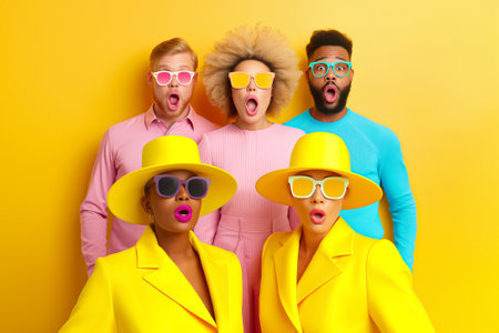 A lively group of four creatively engaged individuals showcases vivid fashion and expressive emotions, emanating joy and energy against a striking yellow background.
