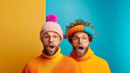 Two enthusiastic individuals showcase their playful style in bright, colorful sweaters, exuding excitement as they pose against a vivid backdrop. Their expressions capture the essence of fun.