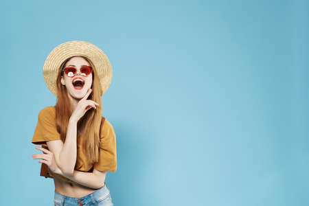 beautiful woman wearing a panama hat and glasses posing Studio Model unaltered