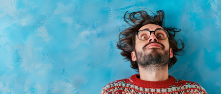 A man with dark hair, a beard, and glasses is lying on his back looking upward, his hair tousled, against a light blue background. He is wearing a red and white patterned sweater.