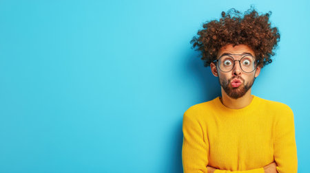 A man stands against a vibrant blue backdrop, making a playful expression with his lips pursed. His curly hair and yellow sweater create a lively, cheerful atmosphere.