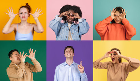 Group of Diverse Friends Smiling and Having Fun in a Colorful Collage Set