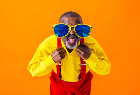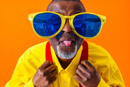 Cool senior man with fashionable clothing style portrait on colored background - Funny old male pensioner with eccentric style having fun