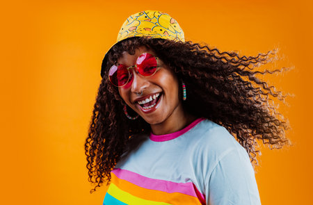 Young carefree latin woman wearing rainbow t-shirt, funny hat and pink glasses is posing with orange background, she has curly hair and is smiling