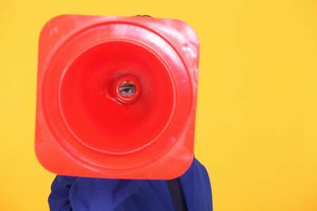 yellow plastic megaphone on blue background
