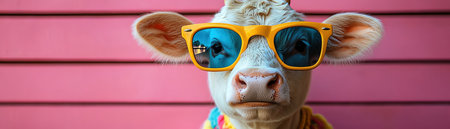 Cow in pink sunglasses and a floral shirt, looking stylish against a soft pink background