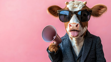 Cow wearing sunglasses and suit, holding megaphone, pink background, quirky and humorous