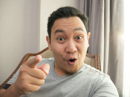 Portrait of young funny Asian man, gesturing shocked or surprised expression with mouth open and pointing to camera