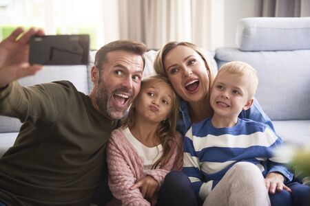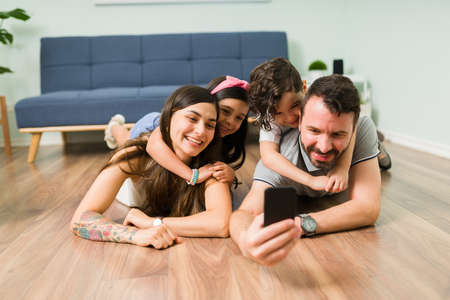 Handsome latin dad taking a selfie with her beautiful wife and cute small chidlren while having fun at home
