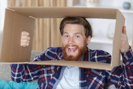 Shocked amazed excited Caucasian European model man male guy homeowner businessman customer client looking at camera gesturing shock wow open mouth wonder excitement indoor living room home apartment