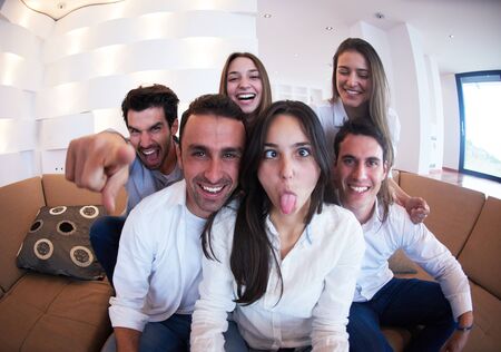 Group of young people taking selfie on smartphone at home party and have fun. Friends enjoy their company, smiling.