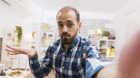 Pov young influencer talking with the audience from his vlogs. Creative and cheerful man.