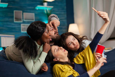 Group of mixed race people taking pictures with phone while sitting on couch in living room spending time together. Multiracial friends posting selfie on internet sharing with other person.