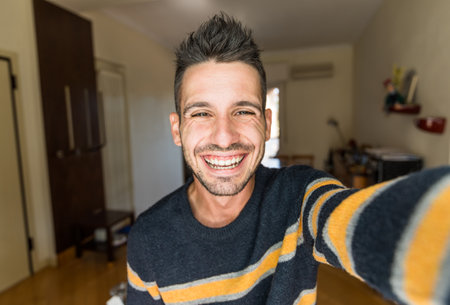 Handsome caucasian man taking a selfie portrait indoor at home - Happy guy smiling at the camera