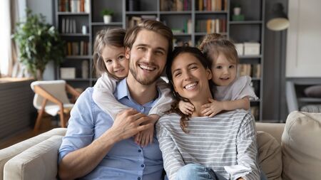 Portrait of young Caucasian family with small daughters pose relax on sofa in living room, smiling little girls kids hug embrace parents, show love and gratitude, rest on couch at home together