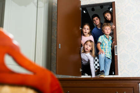 Bearded man in casual clothes is hiding in a closet, he peeps through the open door and looks in surprise with an open mouth and big eyes.