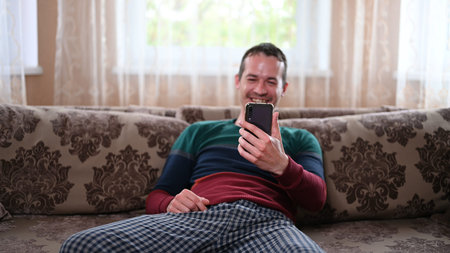 a young married couple at home. They sit on the couch and take selfies or talk on video communication