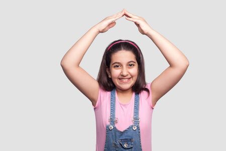 Portrait of happy beautiful brunette young girl in pink t-shirt and blue overalls standing, toothy smile and looking with home roof gesture on head. indoor studio shot, isolated on light background.
