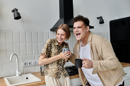 Two friends share joyful moments while enjoying coffee in a modern kitchen.