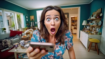 Shocked concerned cellphone user girl staring at screen, looking at smartphone screen, finding problems with online app, poor connection, Internet service, getting surprising bad news