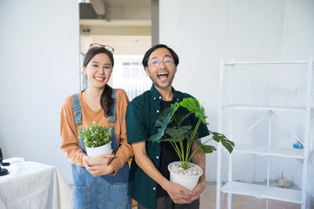 Portrait young couple moving to new house holding Flower Pots Plant Pots looking at camera at home