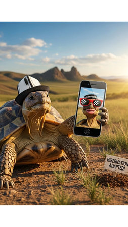 A tortoise wearing a hat takes a selfie in a desert landscape