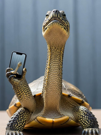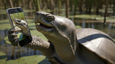 A turtle taking a selfie with a smartphone in a serene natural setting