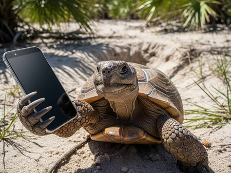 A tortoise sitting on the sand holding a smartphone in its claw