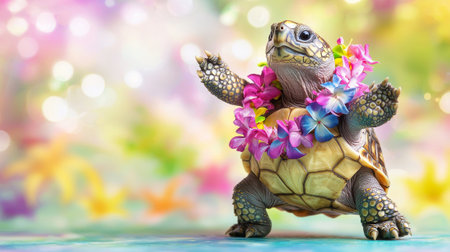 Cheerful dancing turtle with flower lei on vibrant background. concept of joy, playfulness, tropical celebration, nature art, Funny animal, Summer, Hawaiian Flower Lei. Copy space.