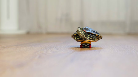 Banner 4:1 land turtle crawls on the floor in the room