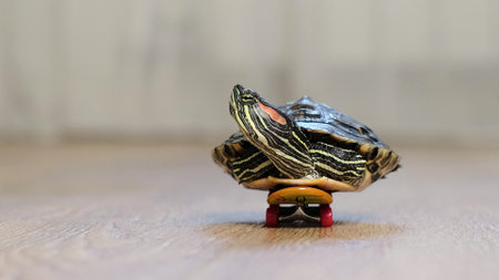 turtle is seen gliding on a tiny skateboard indoors, creating a whimsical and amusing scene. This image blends the charm of nature with an imaginative twist on everyday life.
