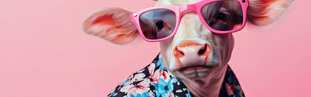 Cow in pink sunglasses and a floral shirt, looking stylish against a soft pink background