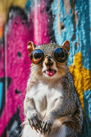 Squirrel in round sunglasses tongue out, bold graffiti trunk backdrop